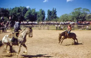 Bronco riding, woman on a mule. Photo gifted by Ann Messler Cuddy.