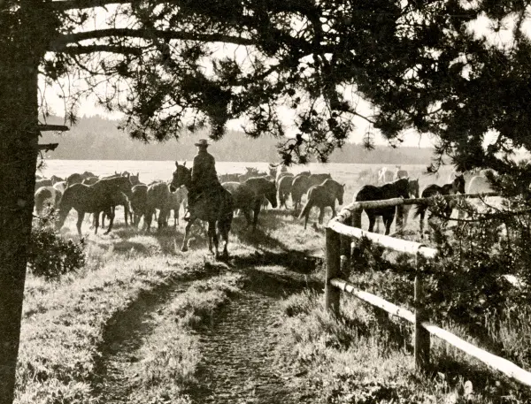 Horses were herded to and from the rodeo site in Jackson or the Teton Valley Ranch near Kelly. Photo gifted by Judith Allyn Schmitt.