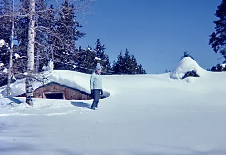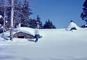 Main Cabin southern side, kitchen extension, buried in snow. Winter residents were known to ski and snowmobile over roofs like this one. Photo gifted by Karin Gottlieb.